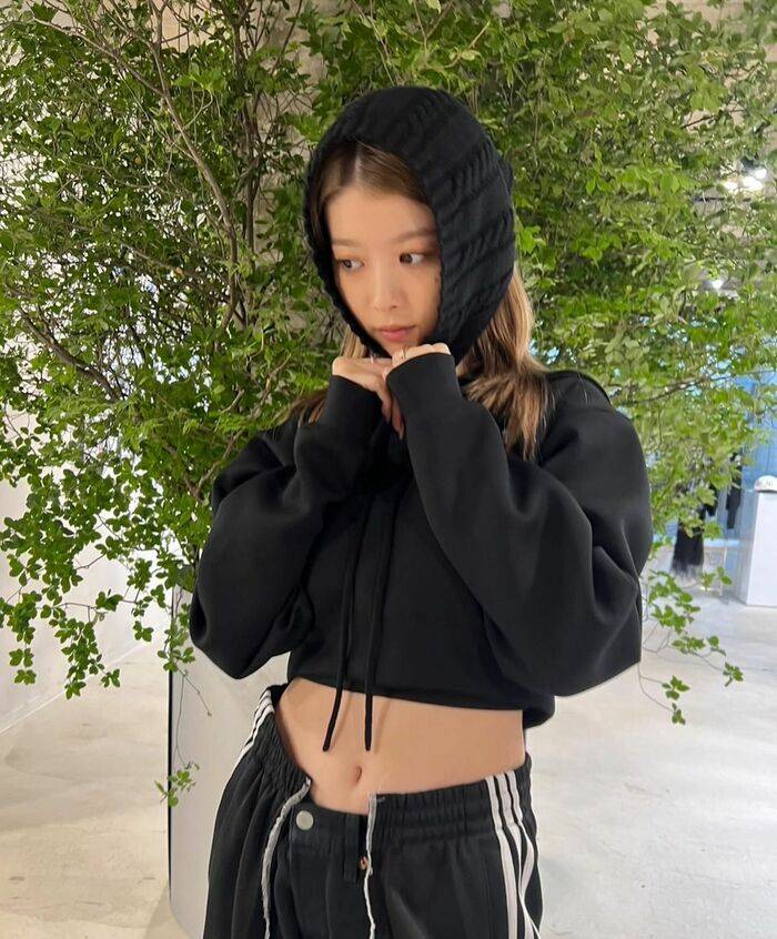 今回の投稿で、馬場さんはお腹が見えるショート丈の黒のスウェットに 黒のパンツを合わせた全身黒のコーディネートで、引き締まったウエストを公開。