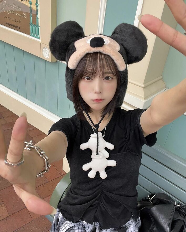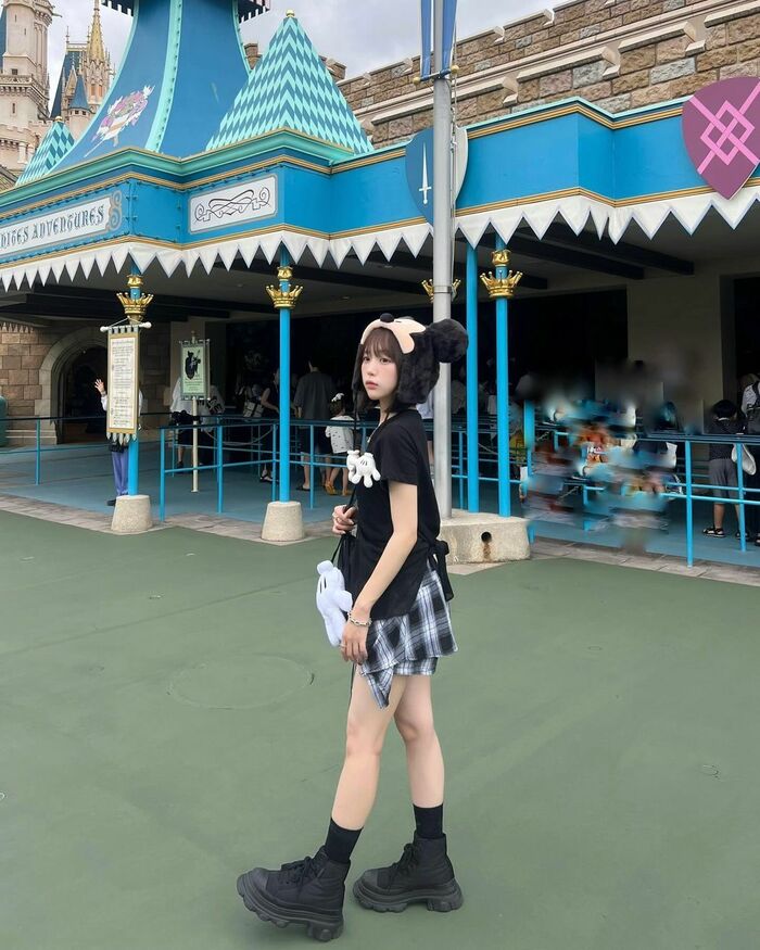 ミッキーマウスのかぶり物をかぶり、黒のトップスにチェック柄のボトムスを合わせたコーデで、ショート丈のボトムスからはスラッとした美脚が。