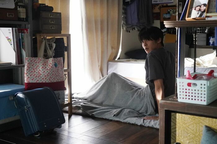 ベッドではなく床に敷いた布団で目を覚ます月岡夏(目黒蓮)。