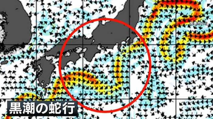 黒潮が今現在、大蛇行って言われているもので、紀伊半島沖から大きく日本列島の本州を離れて、八丈島の近くまで下がってから東京湾に向かって北上してきてます。