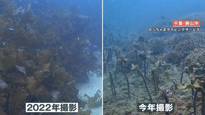 しかし、今年の映像を見てみると…サンゴの隣で茎だけになってしまった無残なカジメの姿が…。見比べると、その違いは歴然です。