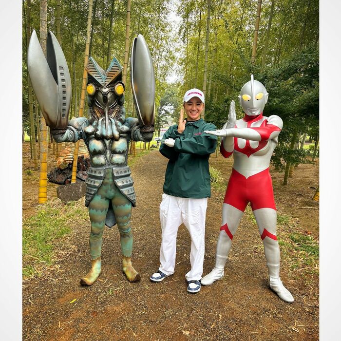 そして、木戸さんは「小さい頃にずっと観ていたウルトラマンや怪獣たちともコース内で会えました(笑)」と、まさかのゴルフ場でウルトラマンに出会ったことを報告!「バルタン星人」と「ウルトラマン」に挟まれ、必殺技のポーズで撮影していました。