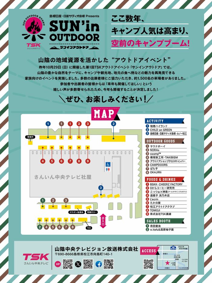 山陰のアウトドアメーカー・飲食店のほか、県外からも多数出店。さらには、落書きカーやサウナ体験など、多くのコンテンツを用意しています。