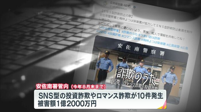 安佐南署管内では、今年8月末の段階で、SNS型の投資詐欺やロマンス詐欺が10件発生。被害額は1億2000万円程にのぼります。