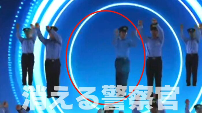 突然、警察官の数が増え、SFっぽい空間で大人数が踊り出します。