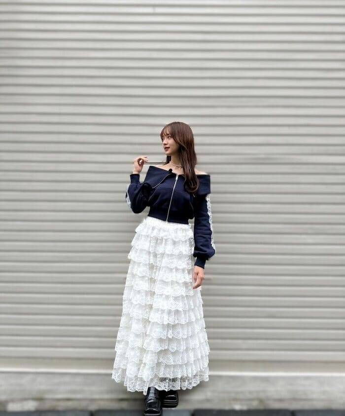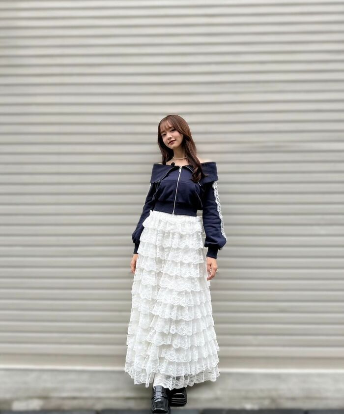 公開された写真には、白いスカートに紺色のトップスを着て大胆にデコルテを出した森さんの姿が。