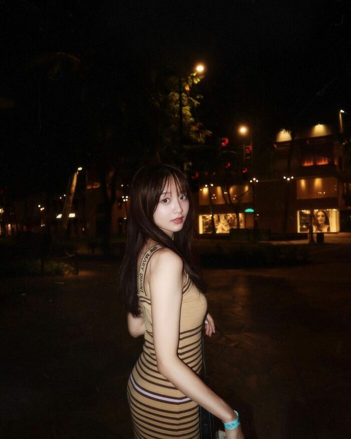 投稿された写真には、ハワイの夜の街並みでボーダー柄のタイトなニットワンピ姿で肩を出した横向きショットを公開しています。