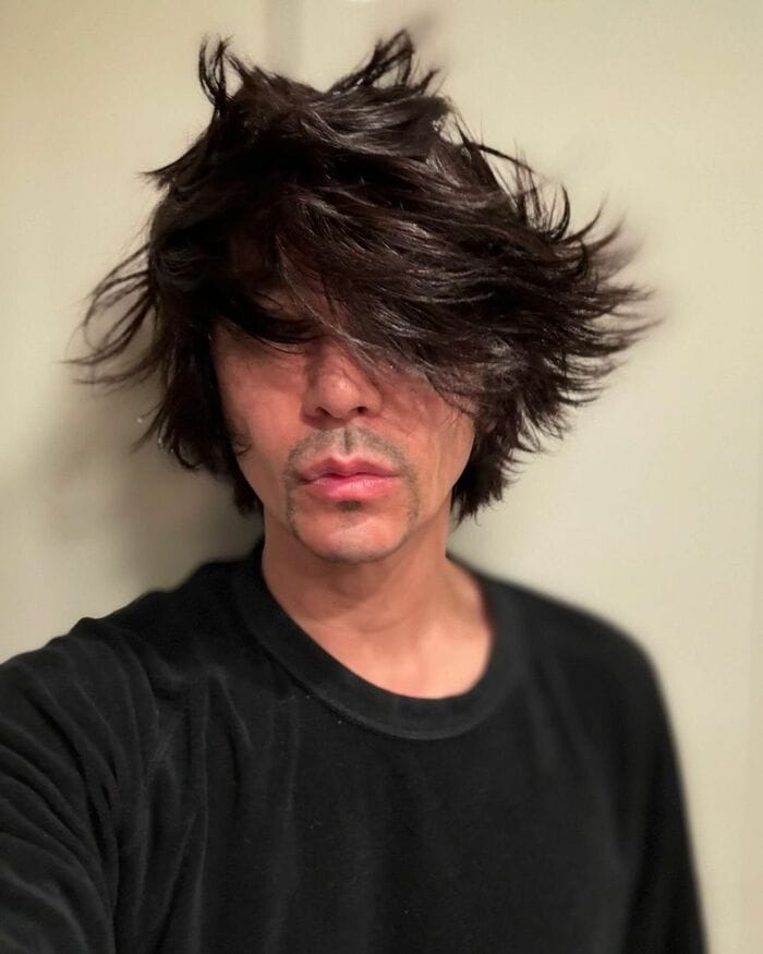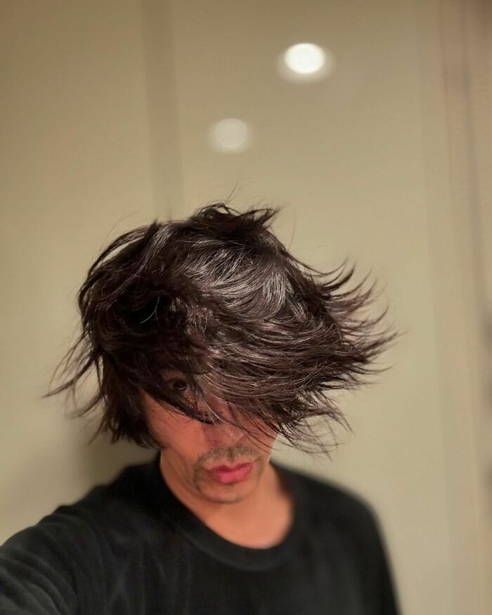 サイドを見せるように顔を横に向けたショットでは、髪の毛があらゆる方向に不規則に癖がつき、前頭部の髪の毛は大きく流れていて、まるで漢字の「右はらい」のようです。