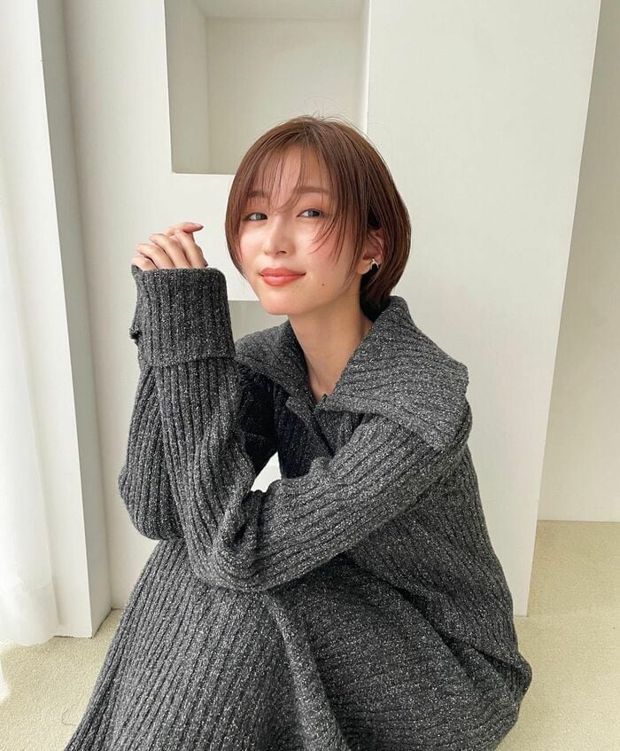 大きな襟が特徴的なグレーのニットワンピースに身を包み、両膝を立てて座り、こちらを見つめる岡崎さん。胸元まであった髪の毛は耳下で綺麗に切りそろえられています。
