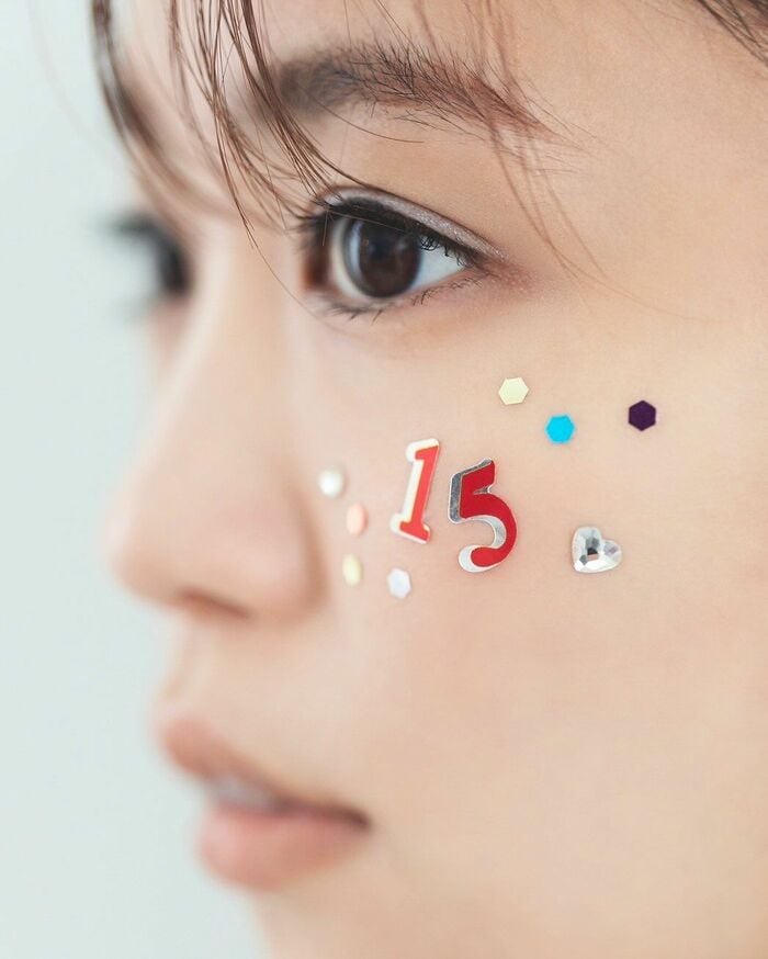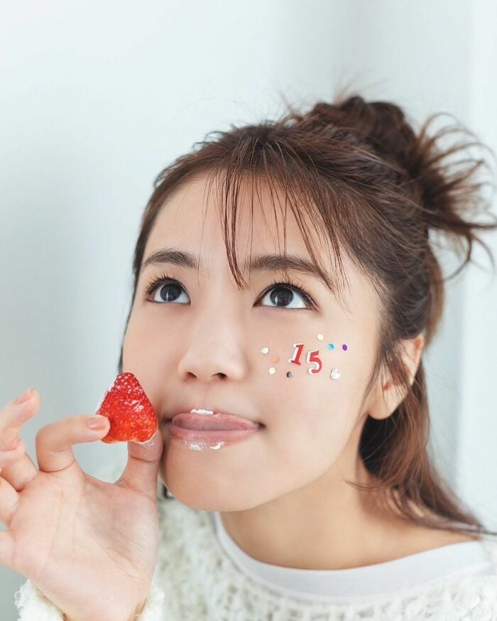 ほっぺに『15』のシールを貼り、イチゴを持ちながら舌をペロッと出しているおちゃめなショットなど!