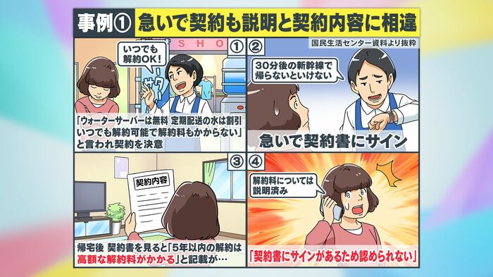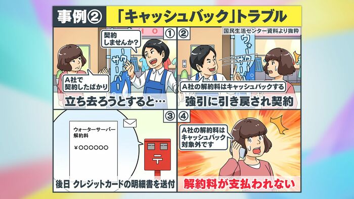①ショッピングモールを訪れた際に店員から「ウォーターサーバーの契約をしないか」と声がけ。「A社で契約をしたばかり」と立ち去ろうとすると…。