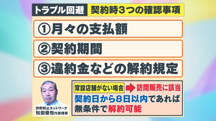 契約トラブルに詳しい、詐欺防止ネットワークの松田俊也代表理事によると、大前提として、契約をする際は書面で行い、その場で目を通した上で、以下の3つをしっかりと確認してサインをすることが重要だということです。