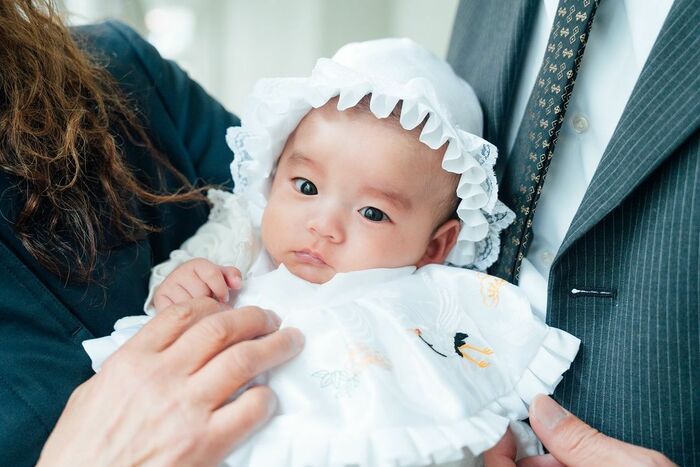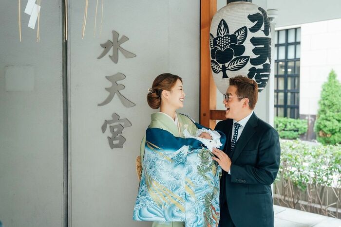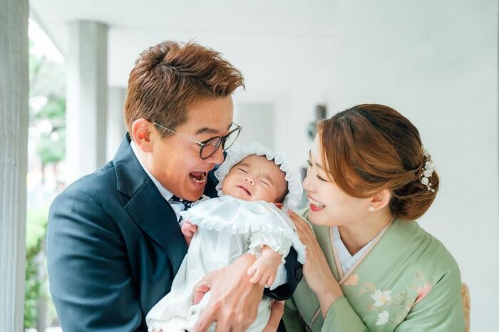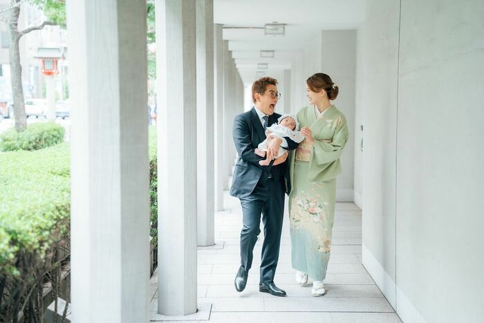 少しだけグズッている様子の長男を、スーツ姿の井戸田さんと、爽やかな若葉色の着物姿の蜂谷さんが優しく微笑みかけながらあやしています。
