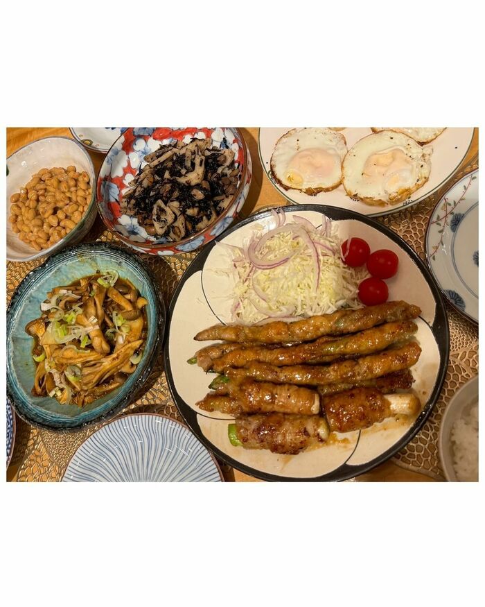 野菜を肉で巻いた料理やひじきの煮物、目玉焼きなど色鮮やかな料理が並んでいます。