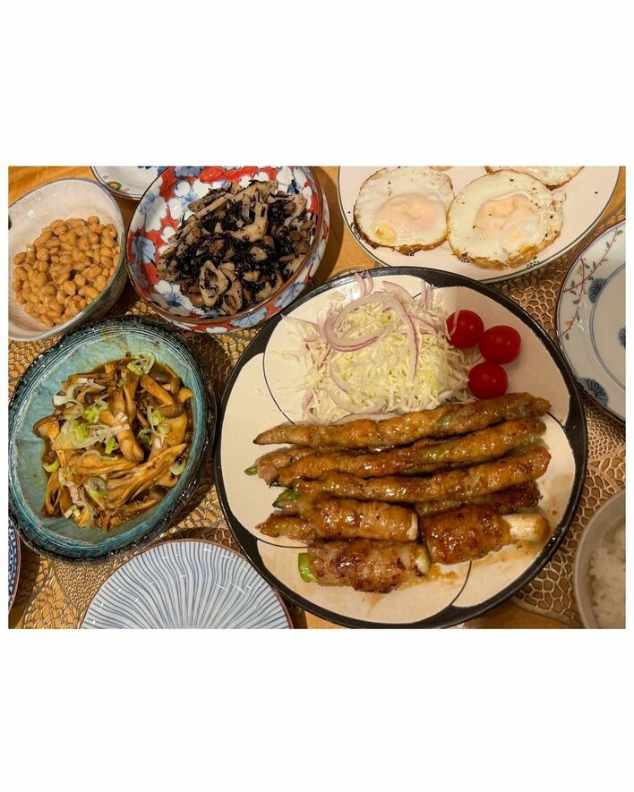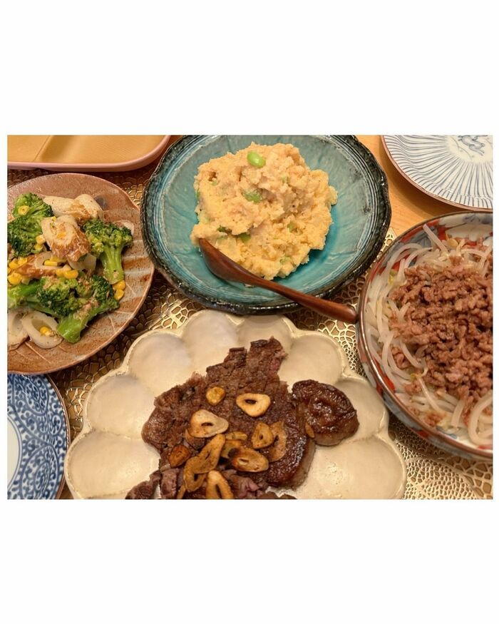 「お祝いでいただいたお肉がおいしかった」「きのこのカレー粉炒めと明太子のポテトサラダは最近のヒットです」とつづった近藤さんは、ボリュームたっぷりな肉料理をメインとした手作りごはんを公開しました。