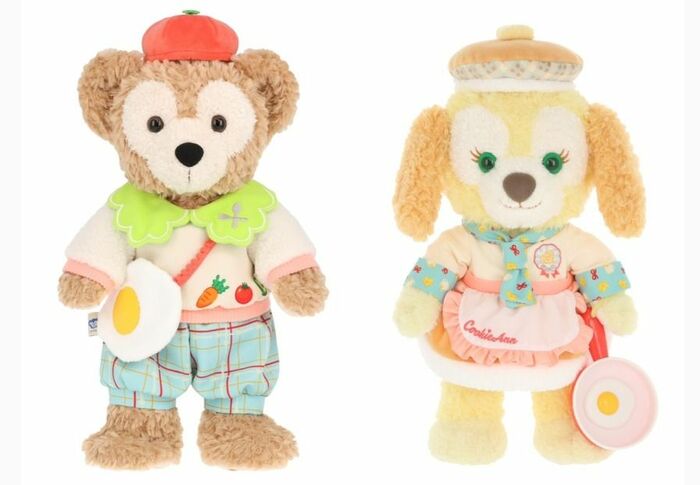 ニンジンやトマトが描かれたカラフルなコスチュームに身を包んだダッフィーや、目玉焼きが入ったフライパンを持つクッキー・アンのぬいぐるみや・・・。