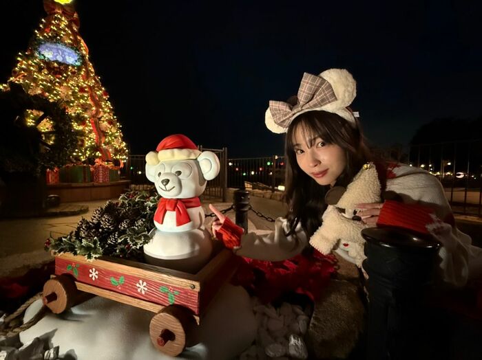 雪だるまにふんしたダッフィーなど、さまざまなフォトスポットがあり、夜は一段と雰囲気があって歩いてるだけで楽しく感じられます。