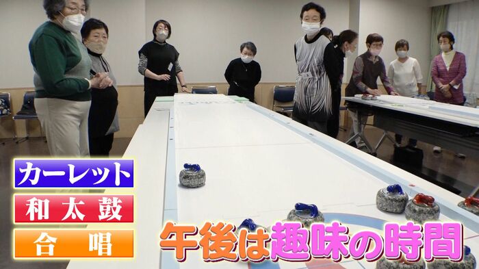 卓上のカーリング「カーレット」に和太鼓や合唱など、午後は趣味の時間を満喫します。