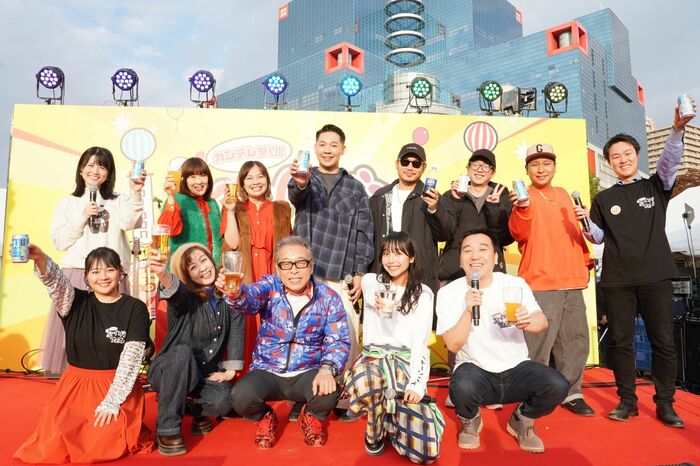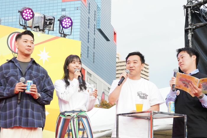 記念すべき初日。晴天の中、扇町公園ステージで行われた乾杯イベントには、登壇予定だった円広志さん、月亭八光さん、山之内すずさん、谷元星奈カンテレアナウンサーに加え、金曜レギュラーの羽野晶紀さん、そして「よ~いドン!歌謡祭」に出演した花*花、ベリーグッドマンも飛び入り参加。