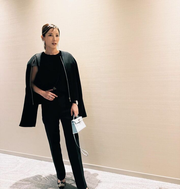 全身黒でシックなモノトーンコーデに白い小さなハンドバッグを持ち、パンツのウエスト部分に手をかけてポーズをとる加藤さん。