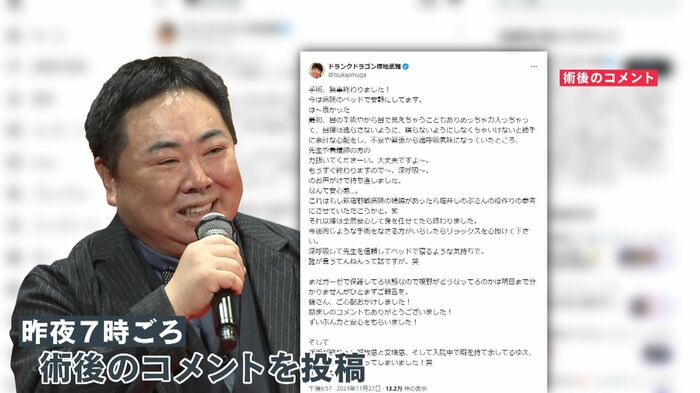 27日、手術を終えた塚地さん。夜にはコメントを投稿しました。