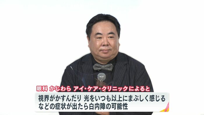 梶原院長によると、視界がかすんだり、光をいつも以上に眩しく感じるなどの症状が出たら、白内障の可能性もあるので、診察を受けてほしいということです。