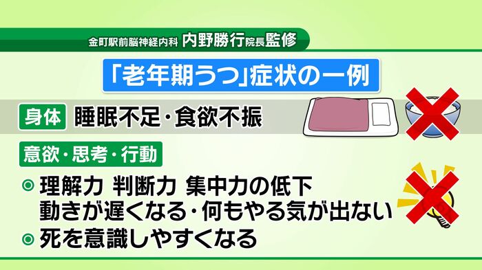 「老年期うつ」になると、睡眠不足や食欲不振に陥ったり、理解力や判断力が低下したり、やる気が出なくなったりして、「普通にできていたことができない」ことへの焦りで悪循環が起こることも多いのだといいます。