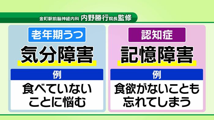 「老年期うつ」と「認知症」の大きな違いは、「気分障害」か「記憶障害」かということ。同じ食欲不振でも、「食事を食べたくない、食欲がわかないと悩む」のは「老年期うつ」の症状で、「食欲がないことや食べたことを忘れてしまう」のが「認知症」なのだそうです。