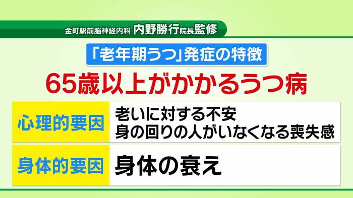 内野先生によると、65歳以上の人がかかる「老年期うつ」は、老化に対する不安からくるネガティブ思考が要因となる「心理的要因」と、身体機能の低下からくる「身体的要因」が主な原因だといいます。