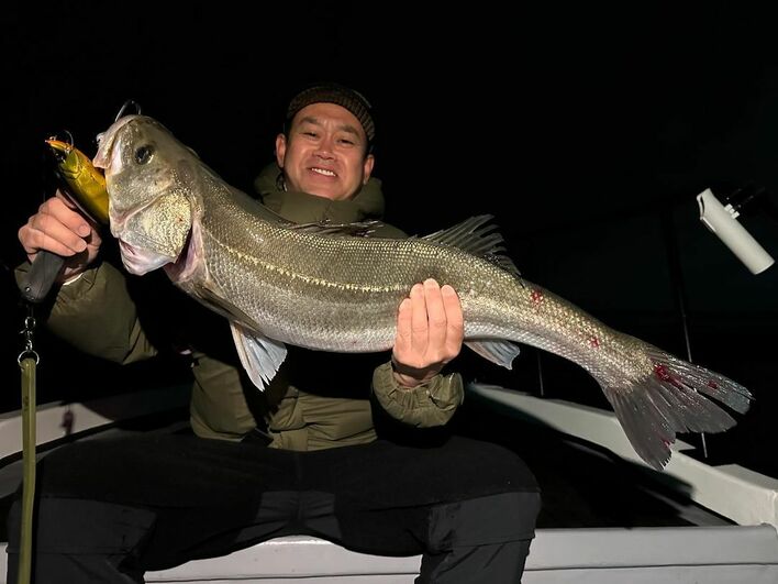 投稿された写真には、まだ辺りが暗い中、80㎝の大きなシーバスを釣り上げ、笑顔の宮川さんや・・・。