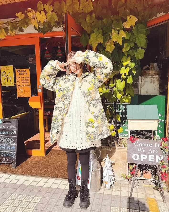公開された写真では、白のロング丈のニットに花の模様が描かれたボアコートを羽織ったスザンヌさんが、アンティークな雰囲気あふれるお店の前でポーズを決めている姿が!