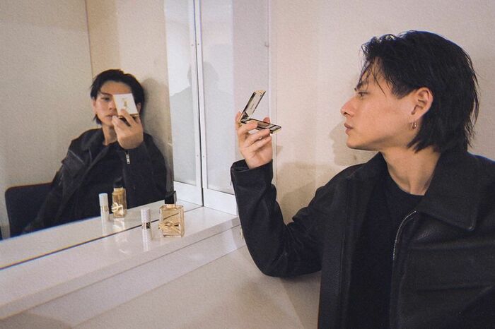 さらに、アイシャドーを手にするショットでは、鏡越しに映る男前な表情に加え、平野さんの綺麗な横顔も。