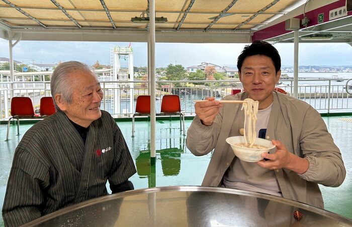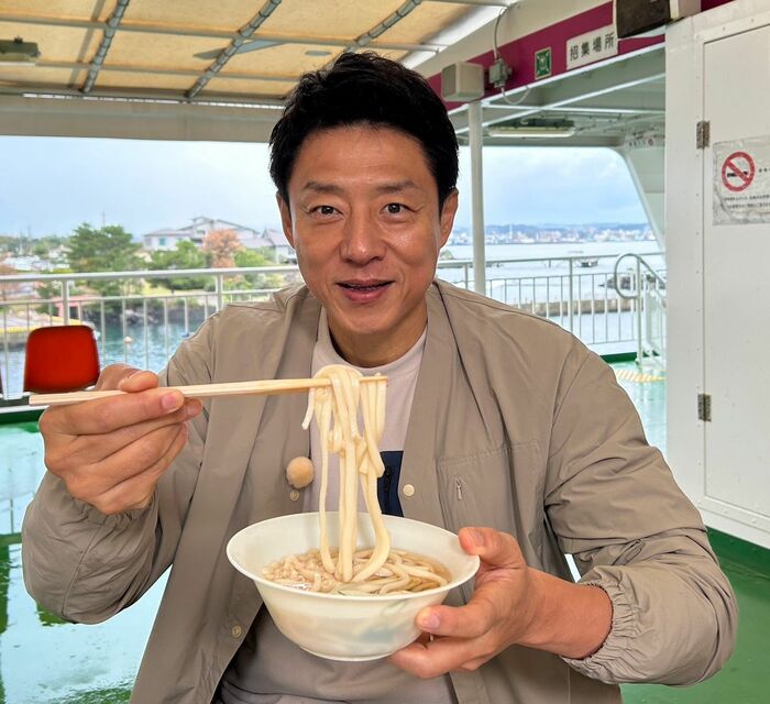 松岡修造さんが、桜島フェリーの潮風に吹かれながら、うどんを堪能しました。