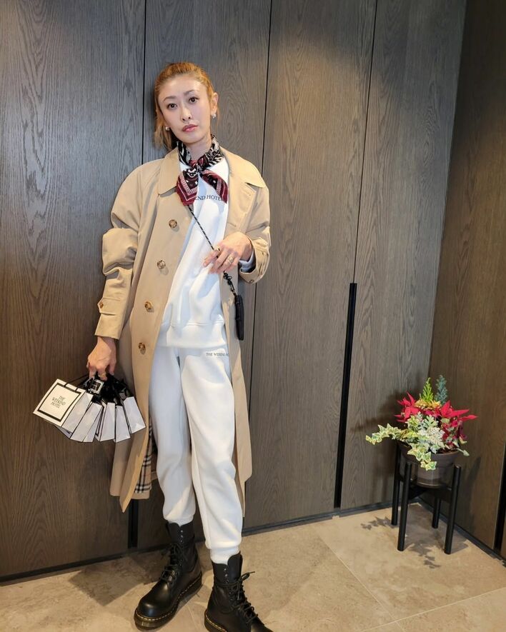 「お世話になった方々へ お歳暮をお渡しに!ハンドタオルにしてみたよ 喜んでもらえて良かった!!」というコメントと共に、山田さんは上下白のスウェットにベージュのロングコート、足元はブーツでかっこよく決めたコーディネートを披露しました。