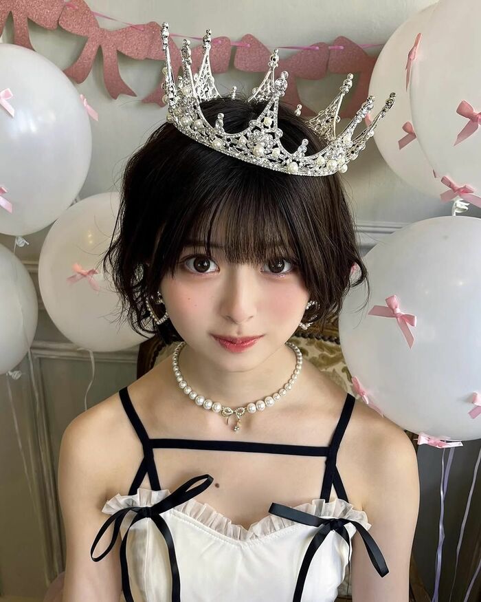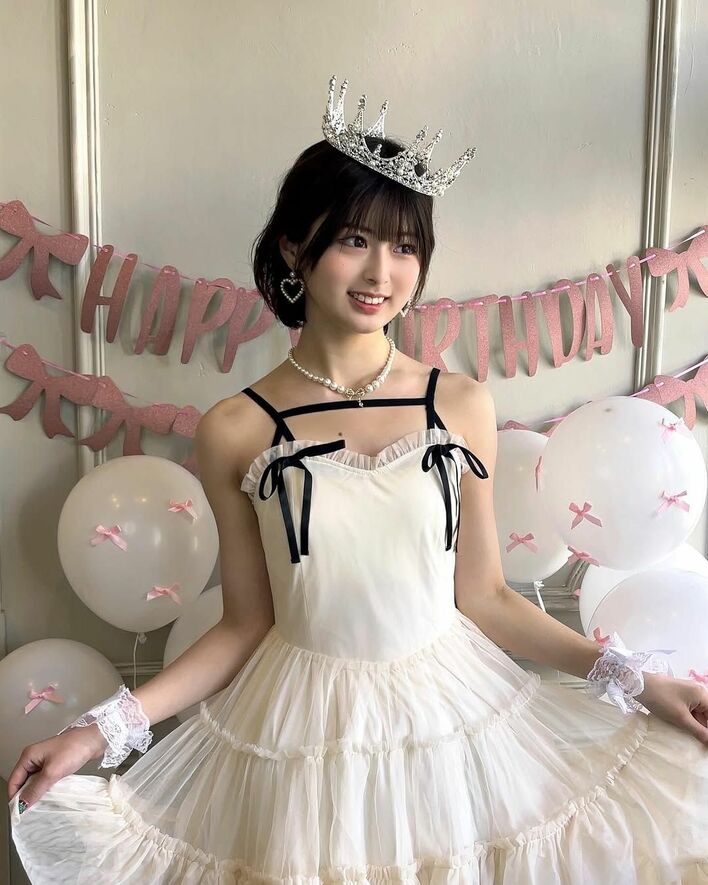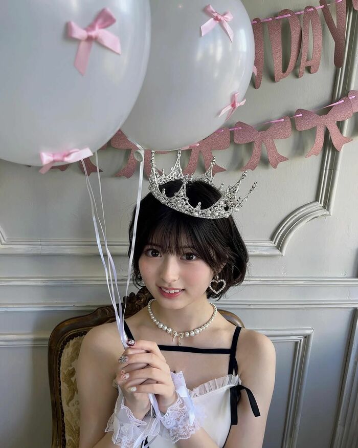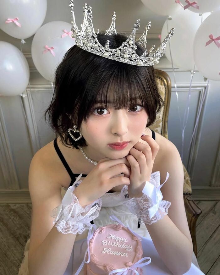 頭にはキラキラと輝く王冠、首には高級感のあるネックレス、耳にはハート形のイヤリングをつけ、胸元に黒いリボンがついている白いドレスを着たHANNAさん。周りにはピンクのリボンが付いた白い風船や、「HAPPY BIRTHDAY」の文字とリボンなどの装飾が施されています。