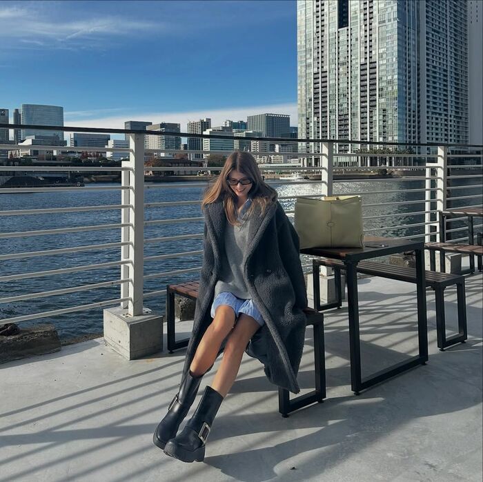 1枚目はベンチに腰かけたマギーさん。爽やかなブルーのミニ丈シャツワンピースに、グレーのカーディガン、ボリューム感のあるブラックのロングコートを羽織り、足元はブラックのミドルブーツのコーディネートを披露。