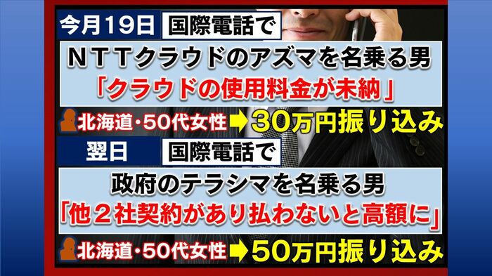 12月19日、北海道に住む50代の女性の元に、国際電話で「NTTクラウドのアズマ」を名乗る男から電話が。男は「クラウドの使用料金が未納」だと話し、女性は近くのATMに誘導され男に指示されるまま30万円振り込みました。