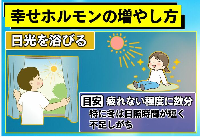 特に冬は日照時間が短く不足しがち。疲れない程度に数分でいいので。