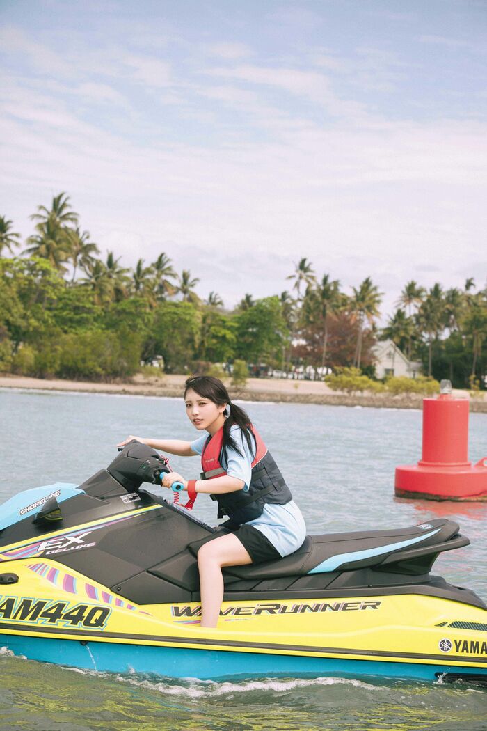 他にも、先行で解禁されたカットでは、オーストラリアでやってみたいことの1つとして挙げていた「ジェットスキー」を満喫する様子も。ライフジャケット姿でジェットスキーにまたがりハンドルを握る、スポーティーな姿や…