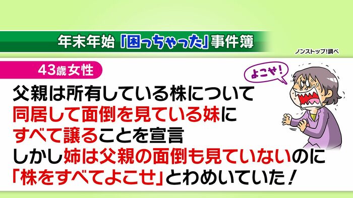 「自分は三姉妹の真ん中。父は自分の面倒を見ている妹に株を全て譲ると言っているのだが、姉が自分によこせとわめいていてうんざり」という、43歳女性のエピソードも登場しました。