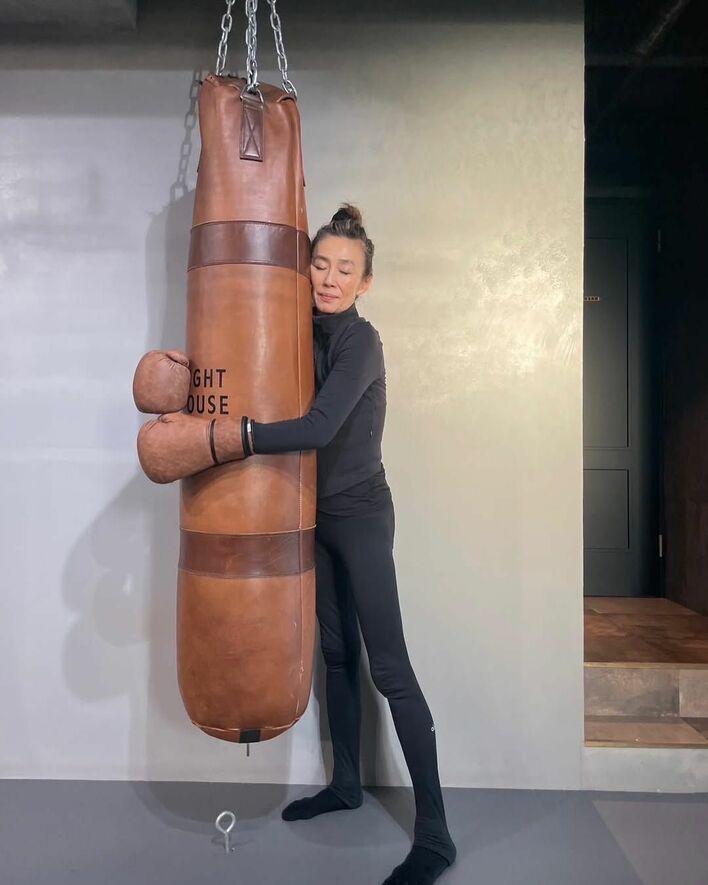 2枚目の写真では、全てを出し切ったかのように目を閉じて満足げにサンドバッグを抱きしめている様子も公開しています。