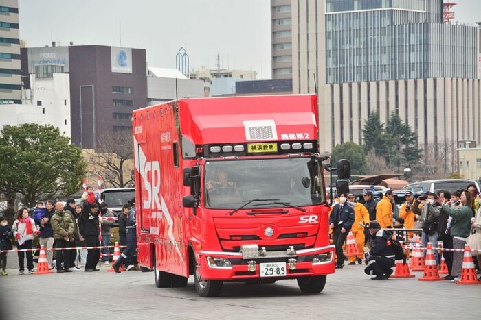この日、赤レンガ倉庫前イベント広場では「横浜消防出初式2025」が行われ、大勢の観客で賑わいを見せる中、出演者陣が消防車に乗ってサプライズ登場すると大きな歓声があがりました。