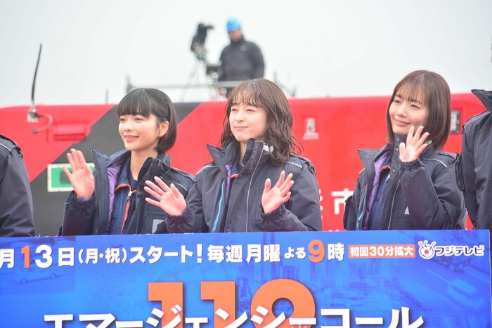 月9ドラマ『119エマージェンシーコール』の会見が1月12日横浜赤レンガ倉庫前で行われ、主演を務める清野菜名さん、瀬戸康史さん、見上愛さん、一ノ瀬颯さん、前原滉さん、中村ゆりさん、佐藤浩市さんが登場しました。