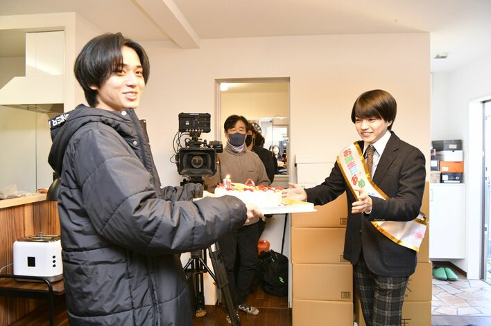 永瀬さんは、撮影現場である社員寮の自室で、西畑さんを待ち構えていました。西畑さんが階段を上がり、部屋のドアを開けた瞬間、「せーのっ!」というかけ声とともに、永瀬さん&撮影スタッフが声を高らかに「ハッピーバースデイ♪ディアー大吾~♪」と歌い上げました。