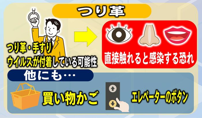 そして、つり革・手すり、他にも買い物かごやエレベーターのボタンなどはウイルスが付着している可能性があり、その手で目・鼻・口に直接触れると感染する恐れがあります。