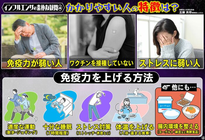 免疫を上げるとかストレスを強くするというよりも、疲れないとか悩まないとか日頃の心がけですよね。時間を見つけてジョギングするようにはしているし、今までどちらかというとショートスリーパーみたいな感じだったんですけど最近は7時間くらいはとるようにしているし、スーパー銭湯、温泉も時間を見つけて行くようにはしていますしヨーグルト、納豆、スープなどもとるようにしています。
