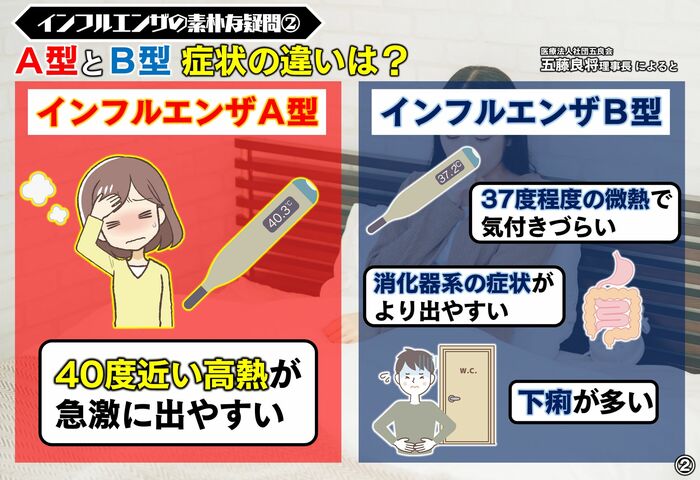 症状はほぼ同じですが、強いて言うなら「A型」は40度近い高熱が急激に出やすい。「B型」は37度程度の微熱で気づきづらい、消化器系の症状がより出やすい、下痢が多い、などの症状が特徴です。