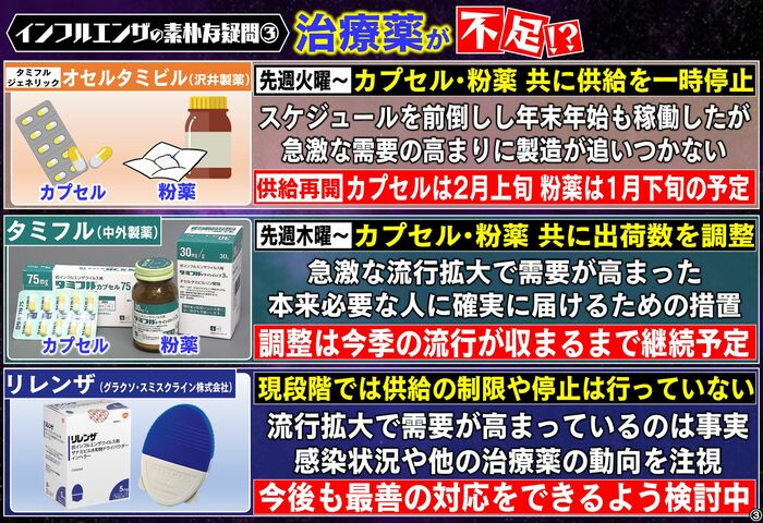 「タミフル」(中外製薬)は1月9日から、急激な流行拡大で需要が高まり、本来必要な人に確実に届けるための措置として、カプセル・粉薬共に出荷数を調整。