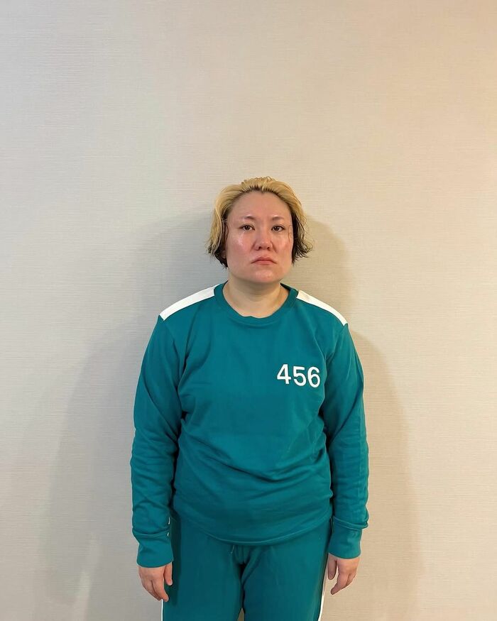その表情は、まさに「虚無」!世界的社会現象も起こしている『イカゲーム』の衣装ですから、もう少しテンションが上がっても良さそうですが…