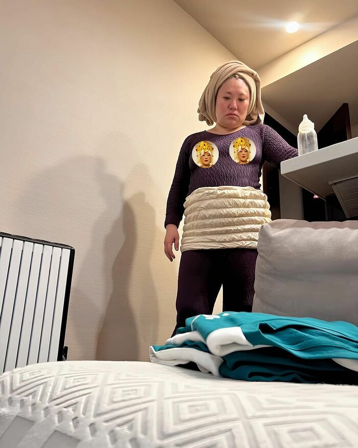 「お風呂から出たらイカゲームのジャージが置かれていました。」というコメントとともに、濡れた髪の毛をバスタオルで覆い、腹巻き姿でソファに置かれた『イカゲーム』のジャージを見つめる自身の写真を投稿したバービーさん。